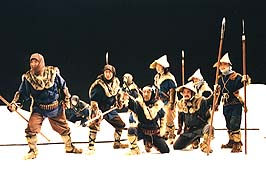 わらび座の特色は、民族の伝統文化をベースにした現代的な作品、舞台機能をフルに活用したオリジナルミュージカルにある。特に、「男鹿の於仁丸」「龍姫」「山神様のおくりもの」など、秋田の民話・伝承、民族文化を基底に据えた演目は、長年当地にあって培われた秋田のアイデンティティを検証する壮大な試みといえよう。 |